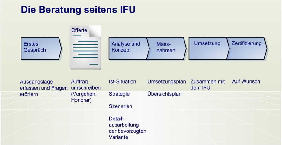 Die Berater des IFU kennen sich aus, wenn es um Prozesse, Systeme und Zertifizierungen geht. Deshalb sind Sie bei uns bestens beraten: Nur wer alle Aspekte berücksichtigt, kann zu einer einzelnen Frage die richtige Empfehlung abgeben.